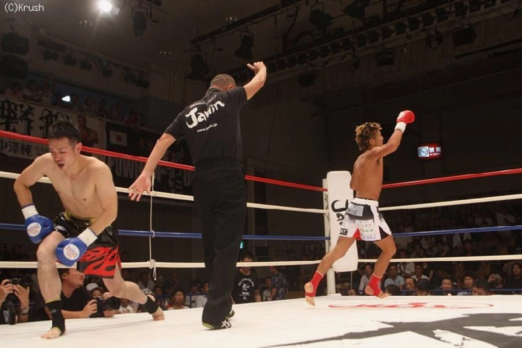 再開後、北井は飛びヒザ蹴りから連打、右ストレートで2度目のダウンを奪うと、再びヒザ蹴りから右フックを打ち込み、3ノックダウンで渡辺をKO。これで北井は勝ち点5、渡辺は勝ち点1となった。