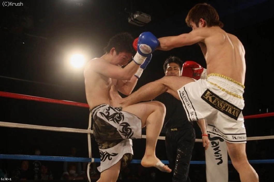 1R、サウスポーのMITSUTAKAがステップしながら右フック、距離をつぶして左右のフックを振り回す。Shi-moは右ローと前蹴りを蹴って右ストレート。この右ストレートでダウンを奪うと、パンチとヒザ蹴りで手数を増やす。