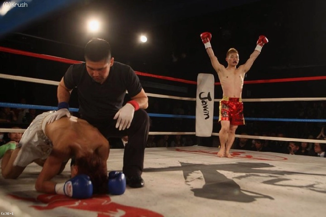 1R、距離を取りながらミドルとローを蹴る林。翔也はじりじりとプレッシャーをかけて強烈な左ボディ。そこから顔面への左フックにつなげ、林をなぎ倒すようにダウンを奪う。再開後、すぐにパンチで前に出ていく翔也。林も左フックを合わせて翔也をぐらつかせるが、翔也がすぐさま左ボディから反撃。パンチとヒザ蹴りでボディを攻め、左右のフックで林をマットに沈めた。