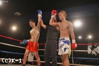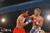 3R、サウスポーに構えた岩崎が右フックから前に出る。下がる緒方に右ミドルと右ハイキックを当てるが、タフな緒方は倒れない。残り30秒、緒方をコーナーに詰めて左ストレートと右フックを叩き込む岩崎だったが、緒方を倒しきれない。