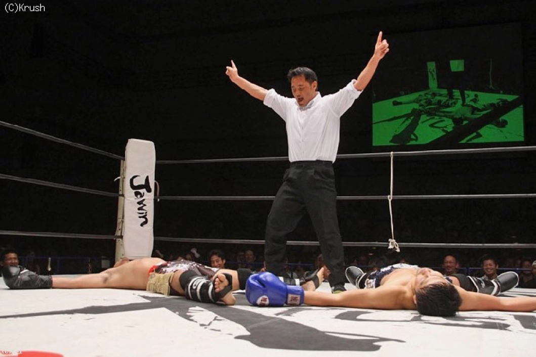 そしてリング中央で足を止めてパンチで打ち合うと、何と左フックの相打ちでダブルノックダウン! 久保坂レフェリーが試合を止めて、両者KOでエキシビションは終了。趣向を凝らしたエキシビションで場内は大いに盛り上がった。エキシビション後、佐藤と大和はそれぞれ「僕には夢があって、それは名古屋をキックボクシングのメッカにすることです。名古屋がそういう土地になるようにみんなで盛り上げていきましょう」(佐藤)、「Krushはカッコいいですね。またKrushのリングにも上がりたいと思うのでよろしくお願いします」(大和)とファンにメッセージを送った。