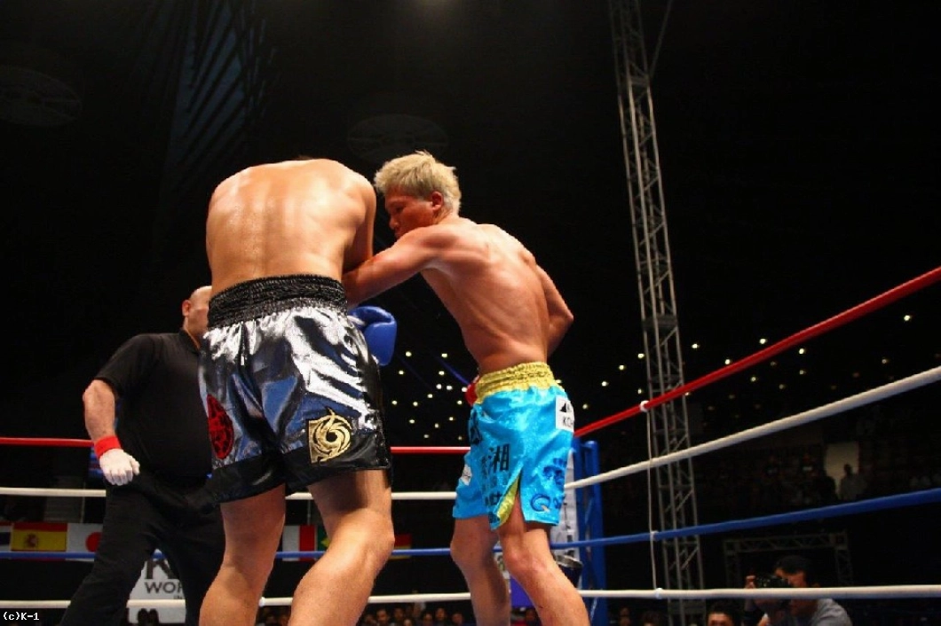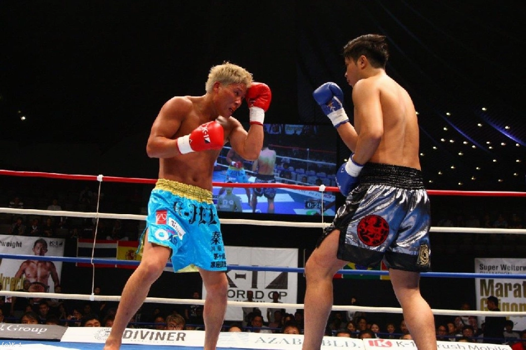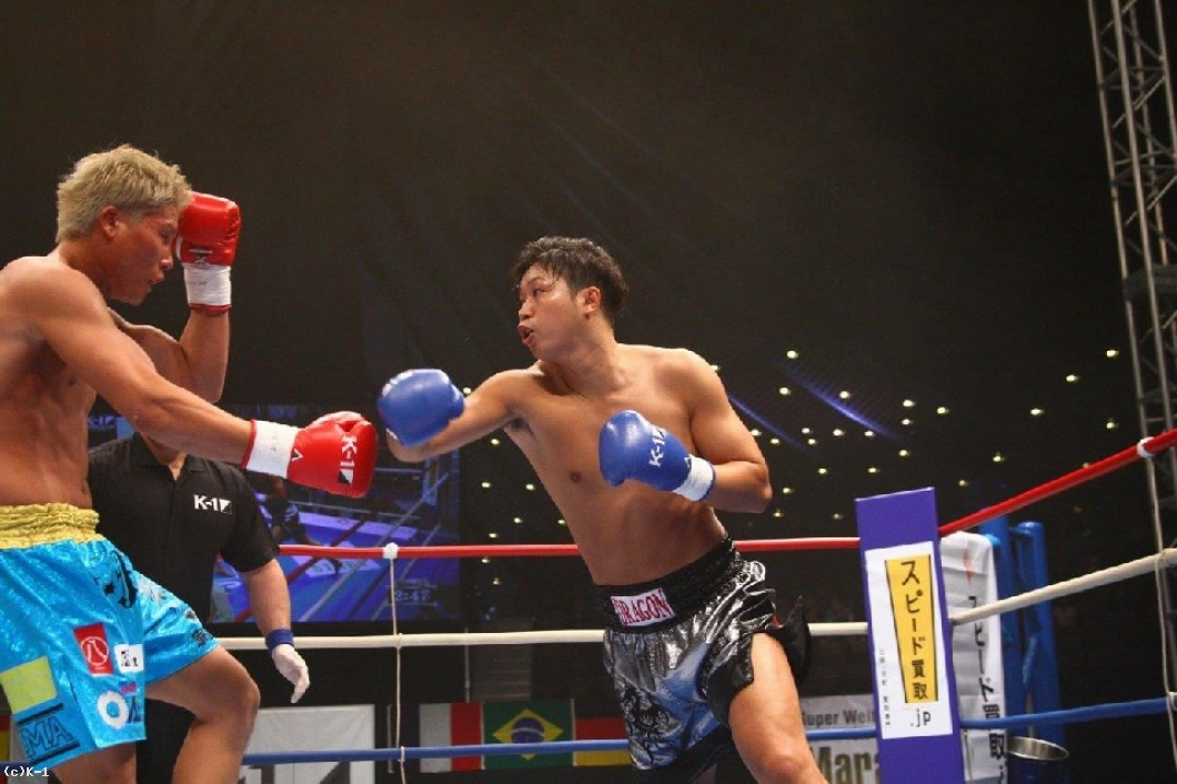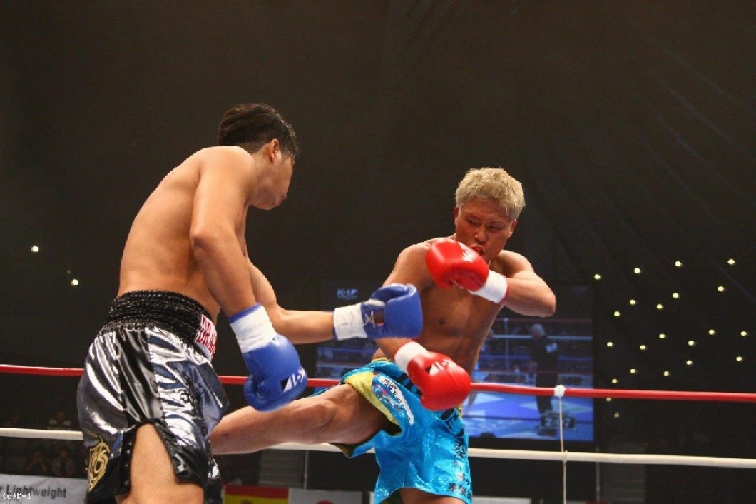 K-Jeeはブロック主体となり、時おり左右フックを返すものの手数が少ない。それでもラウンド終盤から左右フック、右ストレートで斐也をとらえ、一方的に連打を集めて初回を終える。