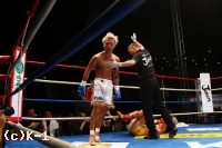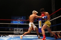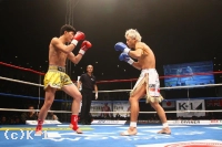 2R、武尊はユンのボディフックをかわし、左ハイをヒット。そこからダウンを奪取せんと向かうが、ユンが思いきり左フックを振るってくるため、武尊はこれを警戒しながらの応戦となる。そして右ストレートを当て、ボディにヒザ蹴り。ユンはややスピードが落ちる。しかしここでユンが跳びヒザ蹴りを放つと足が武尊の下腹部に当たってしまい一時中断。