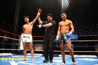 2R、峯山は変わらず左ミドル主体の組み立て。右ジャブ、左ストレートとパンチも繰り出す峯山だが、逆に篠原に右ストレート、左フックで迎撃される。コーナーを背にする篠原だが峯山の攻撃はよく見えていてかわし、追い詰められている印象はない。蹴りをかわして左フック、右ストレートを峯山に返す。
