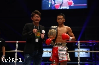 「(試合を振り返って?)練習どおりにできました。KOで勝てたよかったです。(対戦相手の印象は?)ローが軽くカスってたんですけど、痛かったので強い選手だったと思います。(今後の目標は?)3月に防衛戦をして、これからもっともっとK-1を盛り上げるようにがんばりたいです。(三日月蹴りに手応えは?)効いてるかどうかはあまり感じなかったです。最後がしっかり入った感じです。(防衛戦の相手は?)まだわからないですけど、自分でも納得できる相手がいいです。海外でも日本人の選手でも」