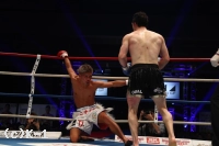 3R、木村は右の蹴りに合わせた右フックでフラつかせるが、城戸は倒れない。やはりダメージがあるか動きに精彩を欠く城戸。逆に木村は動きが見えているかのようにKOを狙う。しかし城戸も木村が前に来るところに左ヒザをボディに突き刺す。だが木村は左フックを当て、右フックを決めて3度目のダウンを奪う。