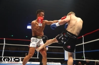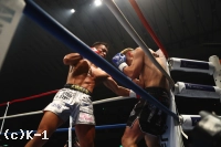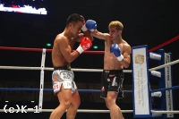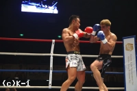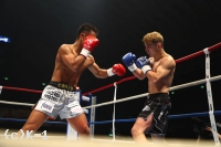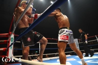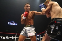 2R、恭士郎は圧力をかけ、パンチ・蹴りを被弾しても前に出てボイドを追い詰めていく。跳びヒザを繰り出し起死回生を図るボイドだが、やはり恭士郎は下がらない。そして左ボディをボイドにめり込ませていく。ボイドも反撃に転じ、後ろ回し蹴りを放つが、恭士郎はガードしてブロック。ボイドにロープを背負わせ展開する。