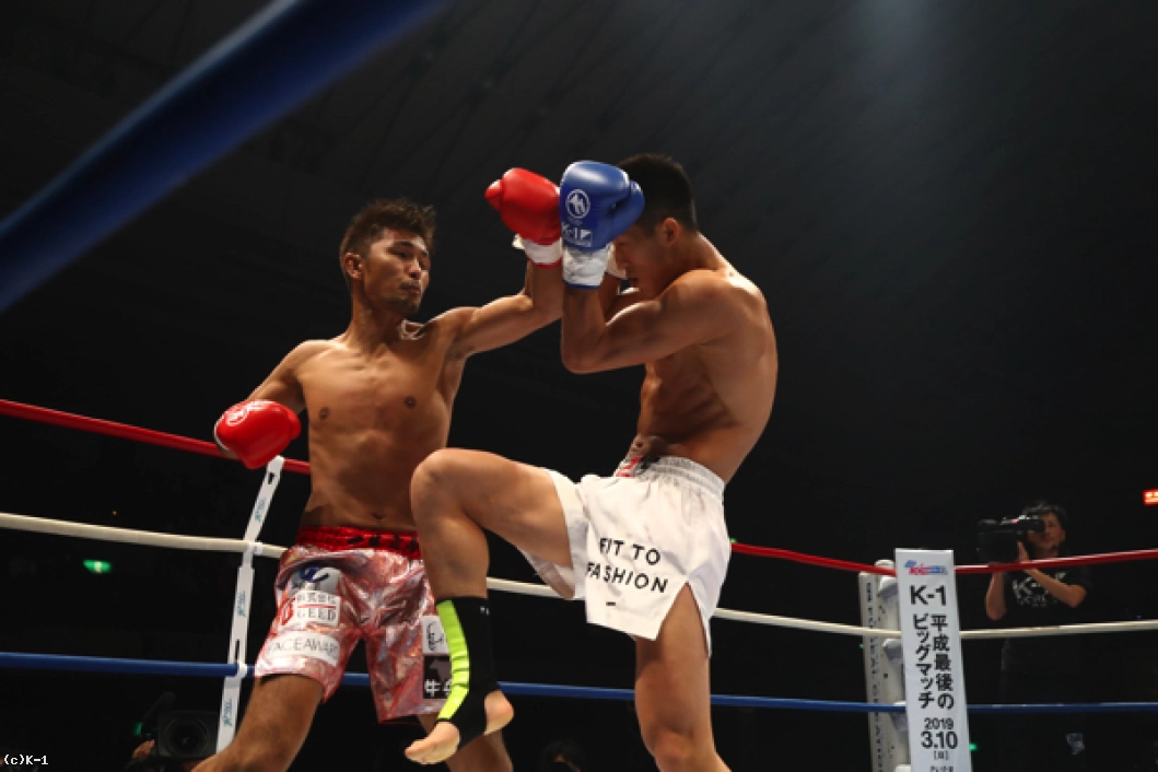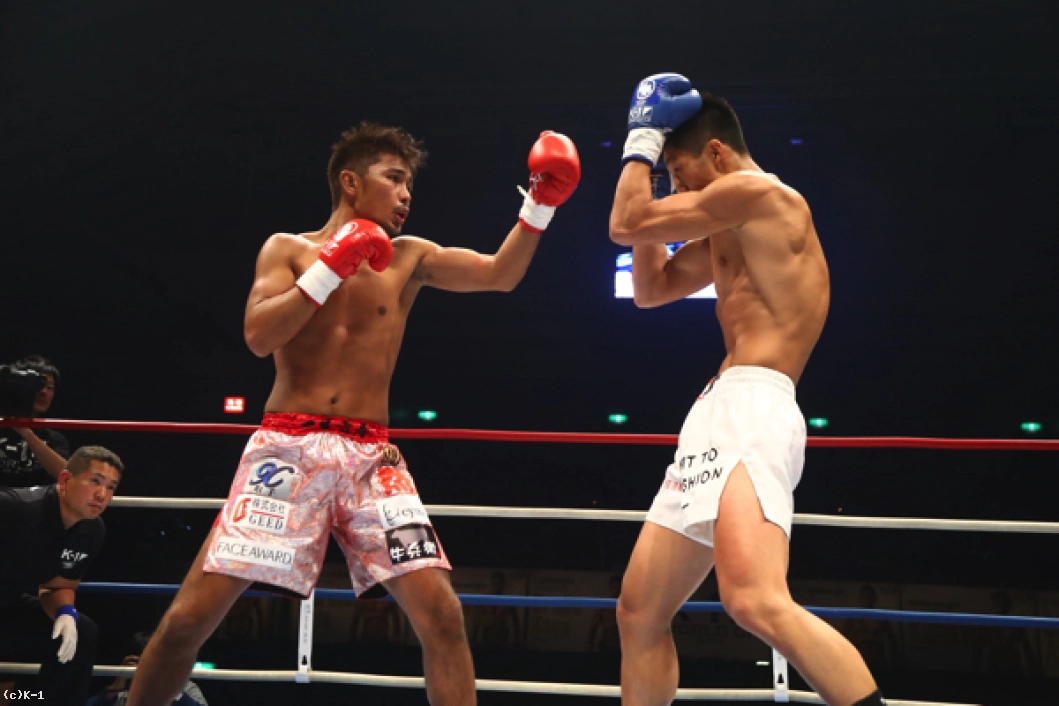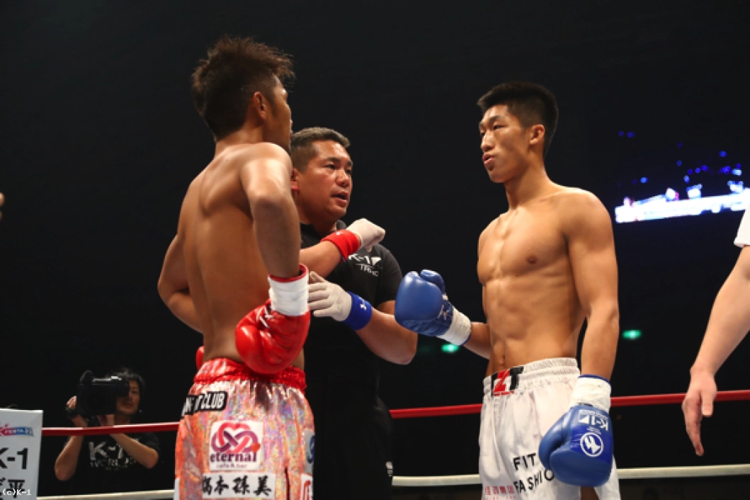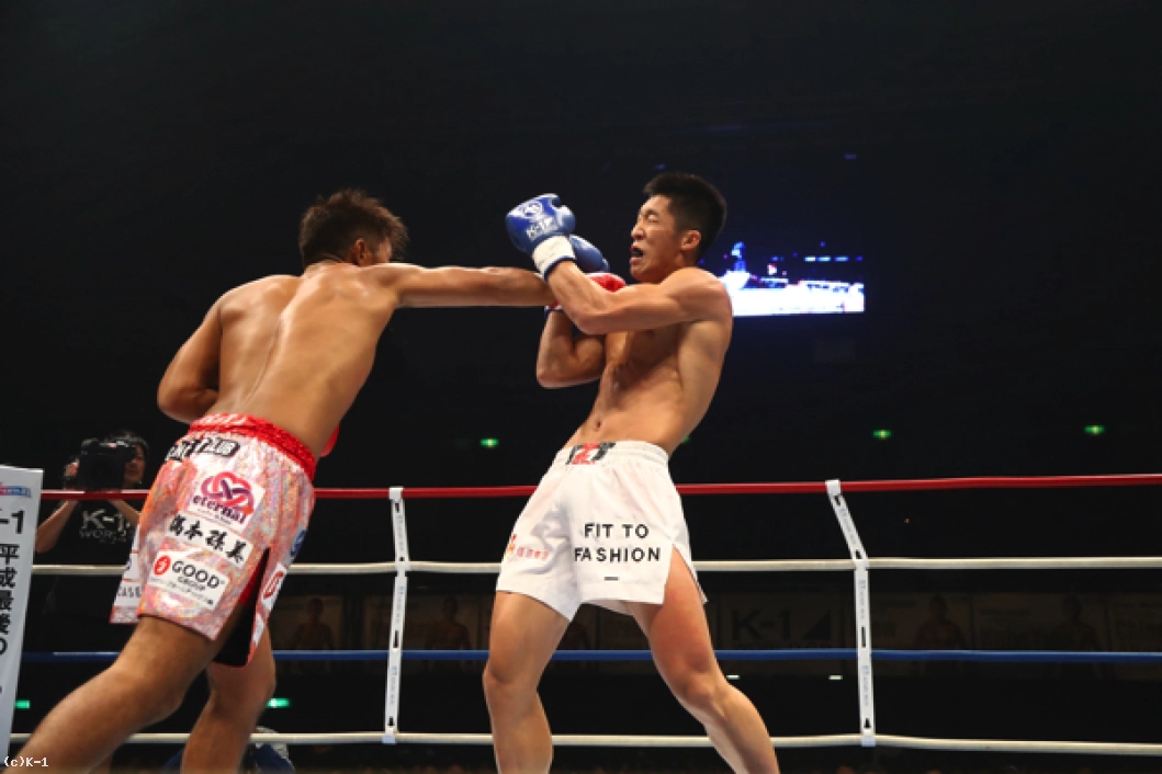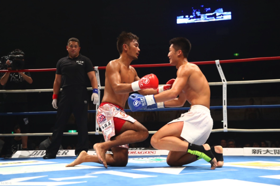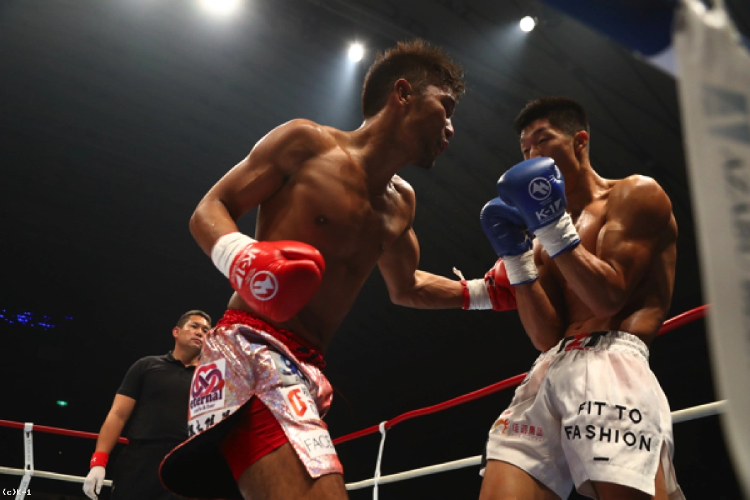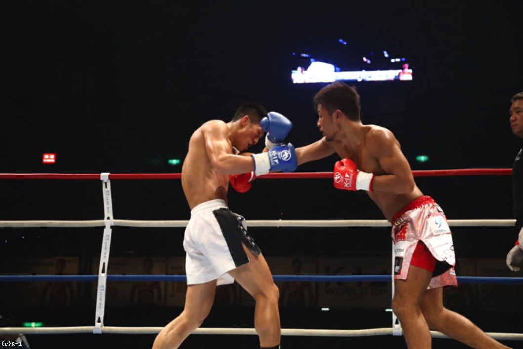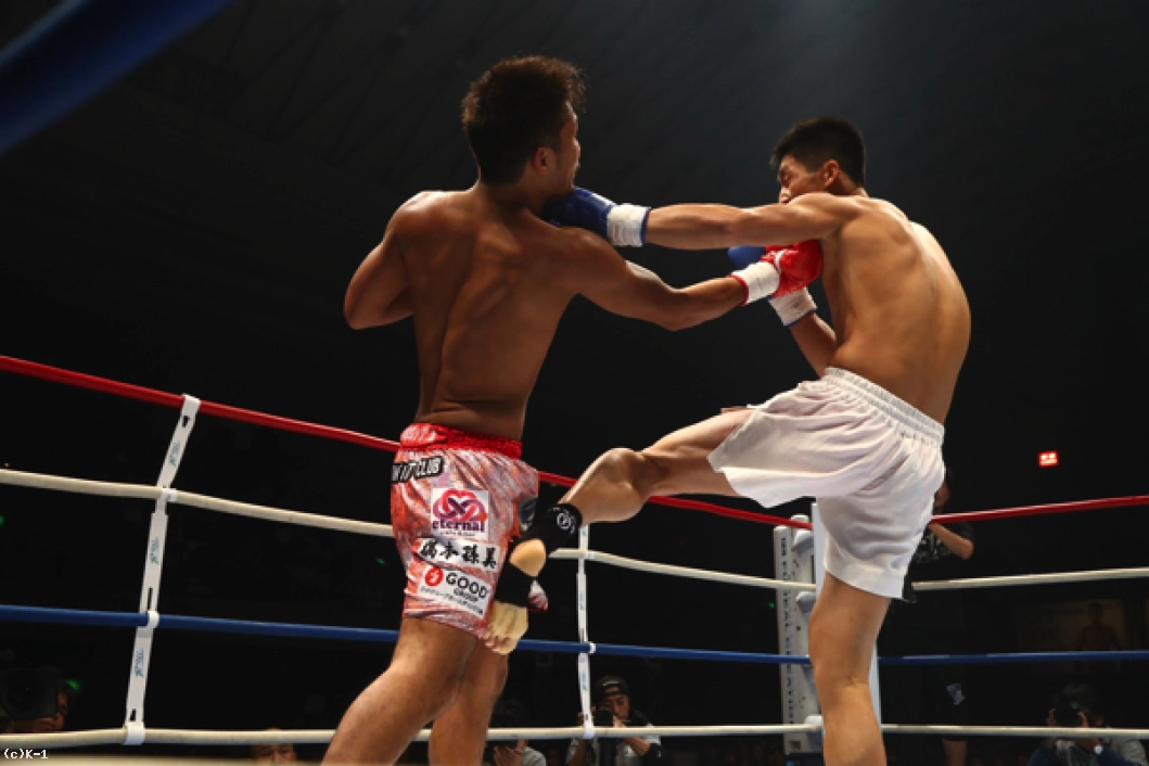 2R、大沢は前に出て右ローを連続でヒット。これを嫌そうにするウェイ。大沢はさらに左右ボディフック、右ストレートと巧みに攻撃を散らしてヒットする。ウェイは長身を利して圧力を発し、前に出て左ストレート、前蹴り、ヒザと大沢を攻める。大沢はダメージを受けガードを固めるが、ウェイはさらに攻撃を集めてくる。しかし大沢も左右フックを顔面に集めウェイをフラつかせる。盛り返した大沢はさらにボディフックもめり込ませウェイに迫る。