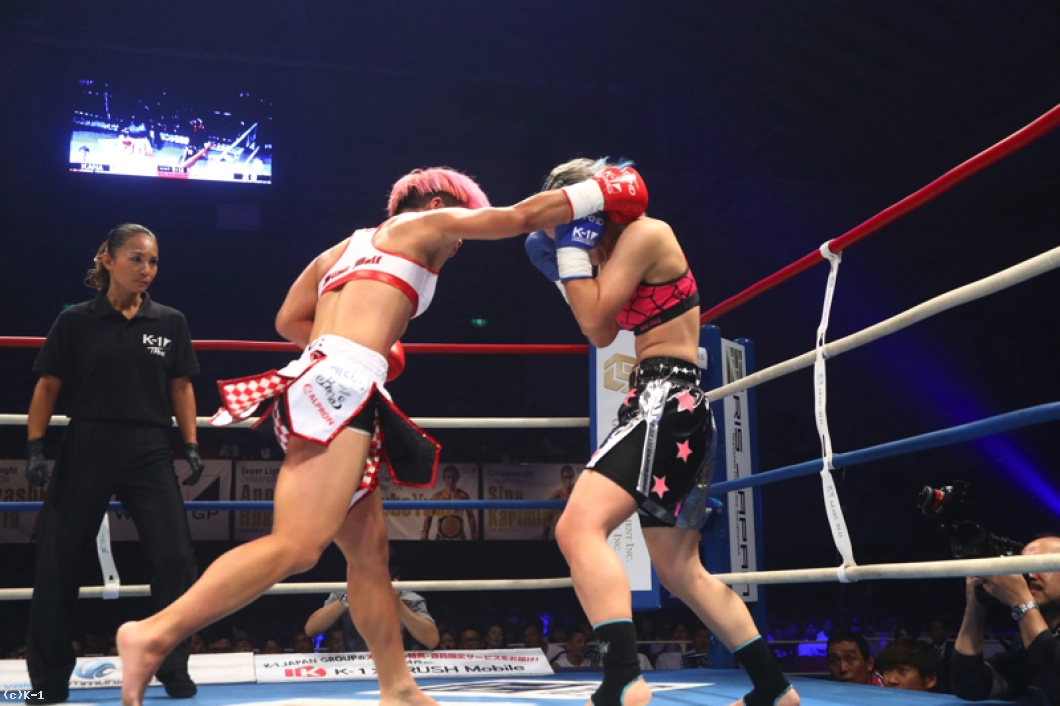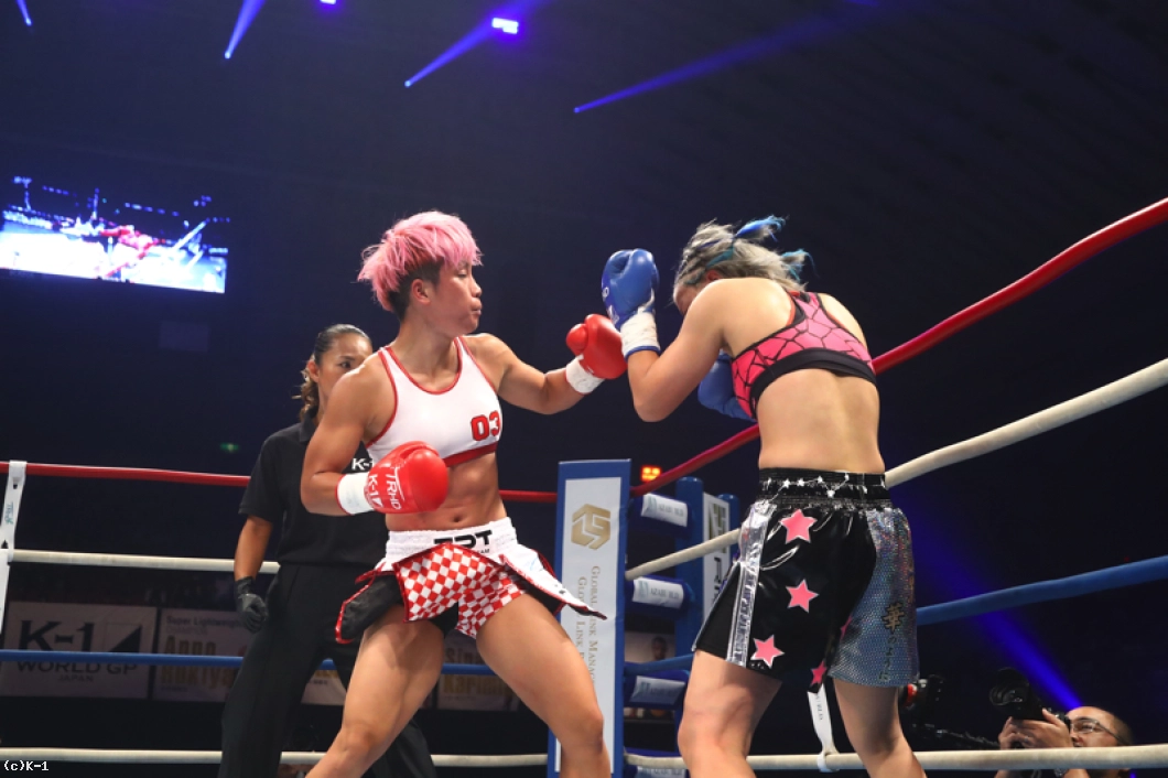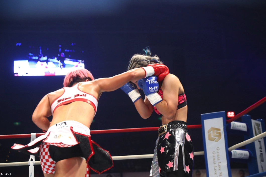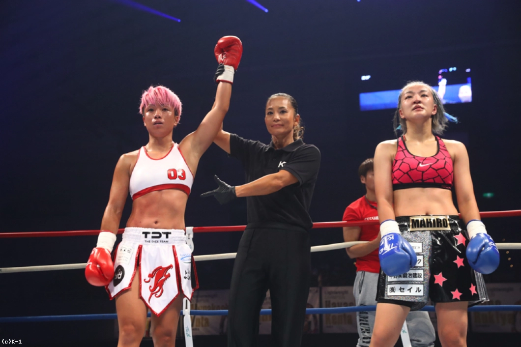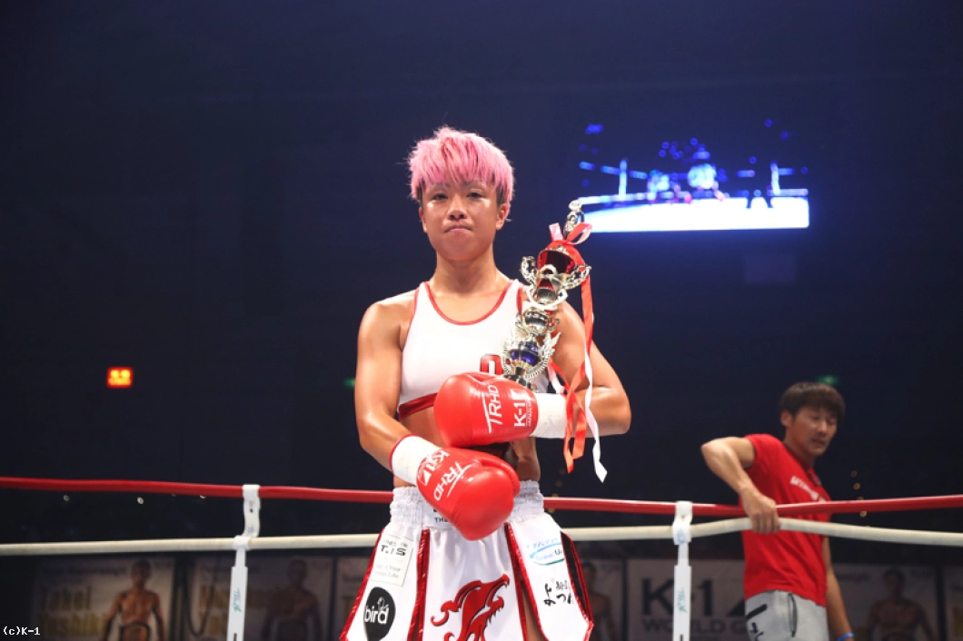 (今後の目標と、ファンにメッセージを)今日は本当にたくさんの応援ありがとうございました。初めて大阪で試合して、気持ちよく試合できました。今後の目標は、大きい目標としてはK-1の女子世界トーナメントを開催して、自分が優勝するということなんですけど、確実に次の試合に向けて、確実に自分が強い姿を見せられるようにもう一回考え直して、次に向かいたいと思います」