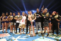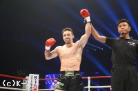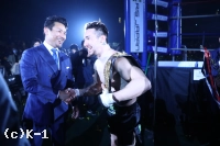 「みなさん、お疲れ様でした。応援ありがとうございました。まだこのベルトを巻いているのが信じられないぐらい、子どもの頃から夢でした。この階級で獲れたのが意味があって、誇り高い気持ちでいっぱいです。僕は解説席のレジェンドに比べればまだまだですけど、魔裟斗選手を超えれるようなスーパースターになるので応援してください。今日は最高でした。ありがとうございました」