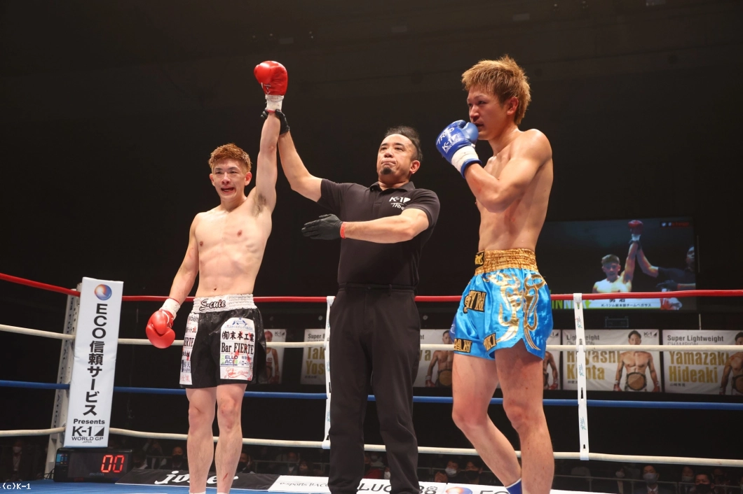 3R、パンチで切り込みたい勇治だが、志樹は距離を遠く取っており、勇治は右ストレートでとらえても浅い当たりにとどまる。志樹は跳び二段蹴り、勇治もフックとストレートを伸ばすが、相手をとらえるには至らない。判定は30-25、30-26、30-27の3-0で勇治。2度ダウンを奪った勇治が勝利した。