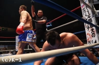 ラウンド終盤、右・左とフックでとらえた植村は左フックでメイサムをなぎ倒しダウンを奪う。