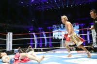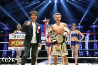 (ファンへのメッセージ)たくさんの応援ありがとうございました。最後のトリで最高のKOを見せれてホッとしました。これからもっともっと格闘技を盛り上げて、もっともっとたくさんの人に知ってもらいたいので。今日の試合見て楽しかった人は、もっとたくさんの人に紹介してもらって。格闘技のパワーを受け取ってもらえたらうれしいので、これからも応援よろしくお願いします。ありがとうございました」
