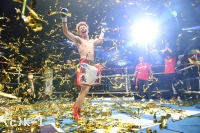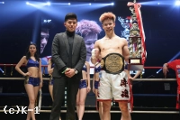 (ベルト巻いた時の率直な心境は?)『おっしゃ! やった!』と思いました。(江川選手と2回戦って、どう違った?)やっぱり足の怪我もなかったんで、威力も凄いし、圧力も凄いあったなと思いました。(そこに勝てたのは自分の何が良かったと思う?)前回はホンマに勝つためだけにヒットアンドアウェイをやったんですけど、今回は僕はマジで倒しに思いっきり当てに行ったんで、ちょっとはそれで嫌がってくれてたんかなとは思います。(本戦と延長の判定については?)僕、試合の内容を全く憶えてなくて、もちろん審判の人が言ったもんがそれは合ってますし、『延長か。でも、まだ負けへんぞ』という気持ちですね、はい。