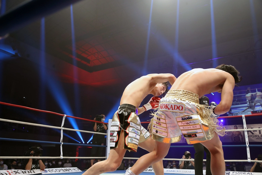 (相手の印象は?)ミドルキックは重たかったですね。2回もらったんですけど、蹴りは重いな。ウェルター級のパワーは感じました。でも試合が早く終わりすぎたのでそこまで印象はないです。(ウェルター級での試合に向けたコンディション作りやリング上での動きは?)僕トレーナーが変わって、和歌山でボクシングとキックボクシング、キックはスパーリングを主にやっているんですけど、その先生からも100点の動きだと褒めていただいて、結果にもでたんじゃないか。自分自身この練習環境に変えてから自信もありましたし、それで大きいことも言えたので、今ウェルター級のベルトを獲るのは俺しかいないと言っていますけど、嘘偽り無く俺が獲ろうと思っているので、その自信があった上での発言ですね。