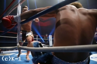 2R、K-Jeeはロー、前蹴り、左ミドル、ヒザと蹴りを中心にした組み立て。そして右ローを当て、右ストレートで愛鷹を打ち倒す。K-Jeeは右ローを効かせて愛鷹に足を上げさせ、左ローも打ち込んで愛鷹にこのラウンド2度目のダウンを与え、ここでレフェリーが試合を止めた。