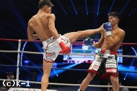 2R、斗麗はこのラウンドも構えをスイッチして応戦。カウンターのハイキックを当て、佑典を接近戦から押して下がらせ、ここで斗麗は顔へのヒザを突き上げダウンを奪う。