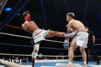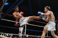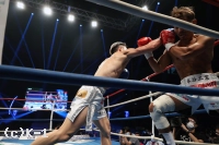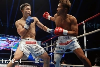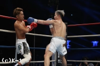 2R、追い詰めてくる西元に対し村越は左ミドル、左ロー。西元が力を込めるパンチは空を切らせる。そしてかわした後で左ストレートを返し西元をとらえる。西元も右ストレートを当て、さらにパンチを繋げるが、村越は連続でのヒットを許さない。