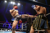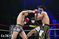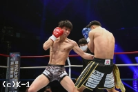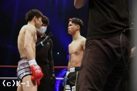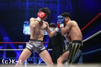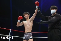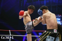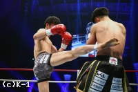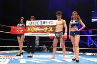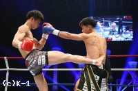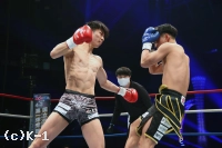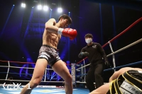 1R、リングの中央に陣取りべた足の玖村。距離を詰める鬼山に右から左のフック。入り際に左ボディから左フックのダブルを放つ。下がる鬼山に右三日月蹴りを突き刺しコーナーを背負わせると、さらに左三日月蹴りを直撃。ワンテンポ遅れて鬼山がうずくまるようにダウンを喫する。鬼山の悶絶の表情を見たレフェリーは即座に試合をストップ。玖村が優勝候補筆頭の評価に恥じない1R1分24秒のKO劇で、準決勝への切符を手にした。