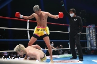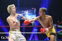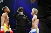 2R、下がる芦澤へ細かい左ロー。下へ意識が向いた芦澤に左フックを直撃。芦澤がダウンを喫する。立ち上がった芦澤をロープに詰めた西元が左右の連打をみせると、芦澤は真っ向勝負。右フックでダウンを奪い返す。立ち上がり距離を詰める西元へ、芦澤はヒザをボディに連打。2発目のヒザで2度目のダウンを奪う。最後は左ボディから右フックを打ち下ろし3度目のダウンを奪取。芦澤がダウンを跳ね返す大逆転のKO勝利を収めた。