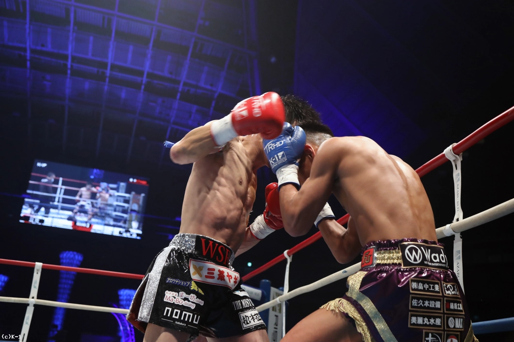 2R、外から鋭い右カーフ、右ストレートを放つ迅。ガードを固め前に出る光佑へ右カーフ。左ローと散らし光佑の左足を削る。光佑の重いローに迅が左前蹴り、右ストレートから左フックとコンビーネーション。ホールディングで警告を受けた光佑を迅が右ボディ、右アッパーと多彩な攻撃で攻め立てる。