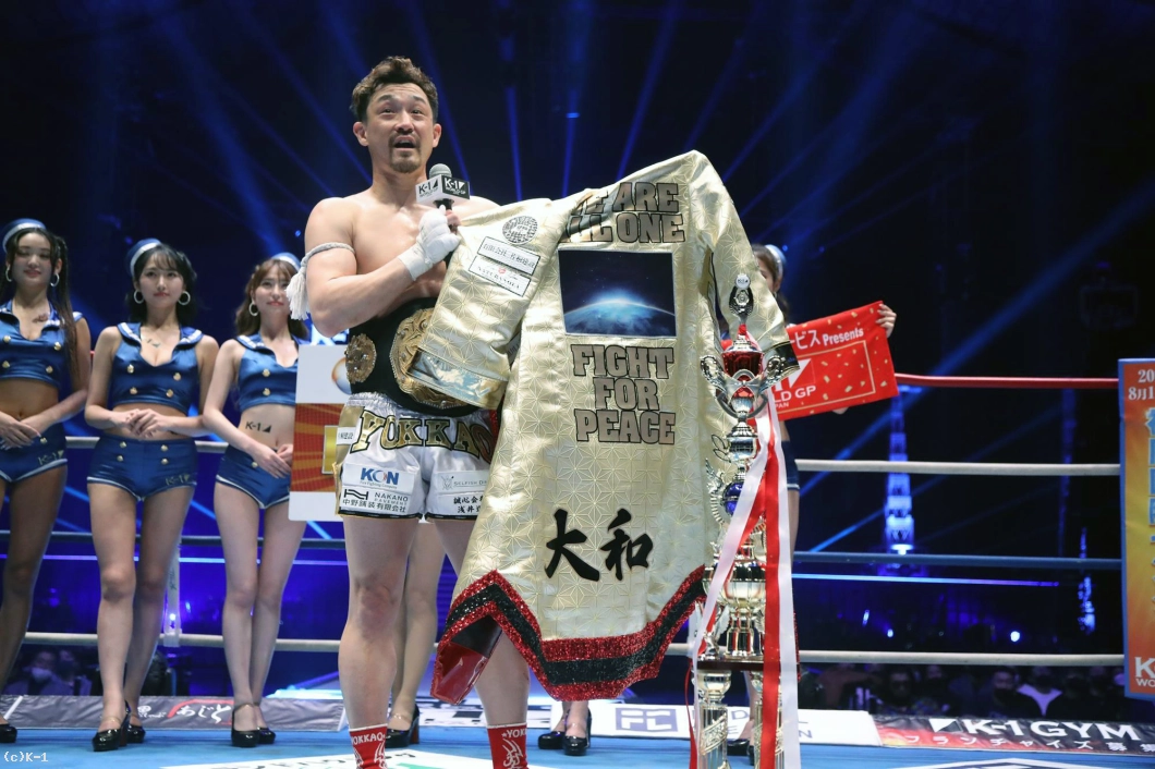 (ファンの方へメッセージを)今日は応援ありがとうございました。この新生K-1の祭典K'FESTAでベルトを巻くことができたのを本当にうれしく思いますし、これからK-1チャンピオンとしてチャンピオンらしい試合をしていくことが、自分として気が引き締まる思いでいます。これから最高の試合を量産していくので、今後とも大和哲也の応援をよろしくお願いします。Fight for peace」
