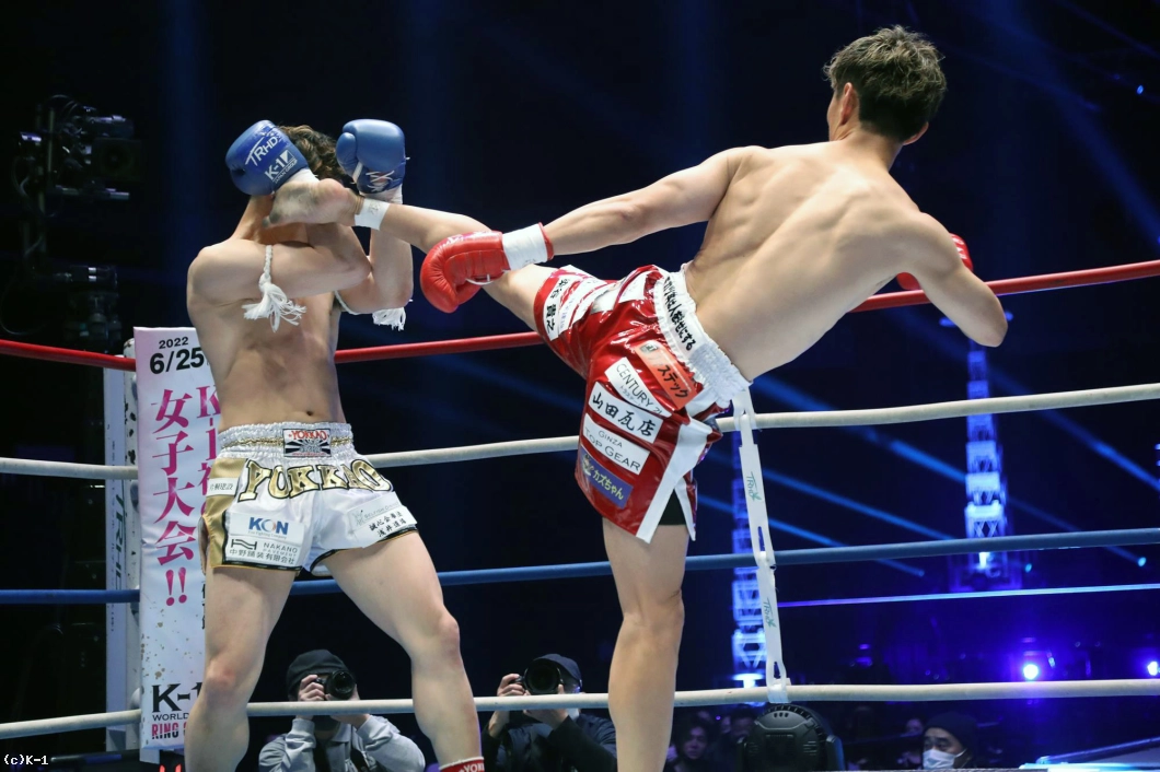 「(試合の感想は?)本当にうれしいのと、現実なんですけど夢の様な感覚があります。うれしいんだけど、逆にここからがスタートだなと気持ちが引き締まるほうが強いかなと思います。あとは久々に連絡が鳴り止まなくて、K-1すごいなと思います。(相手の印象は?)試合前は山崎選手が本当に怖くて。そういう相手に対する恐怖心が自分を成長させてくれたなと思うので、そういう恐怖心がプラスのストレスに変わったなと思います。やる前からすごく強いのは分かっていましたし、向きあって強さも感じましたし。僕タイ人とかいろんな選手と試合をやっていますけど、脛が切れたのは初めてなんですよ。いろんな選手とやってますけど脛が裂けるのは初めての経験で。それだけ試合はたまたま一瞬で終わってしまいましたけど、本当に強い選手だったなと思いますし、確実に過去最強の日本人選手だったと思います。