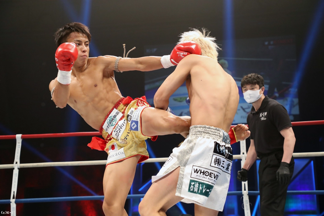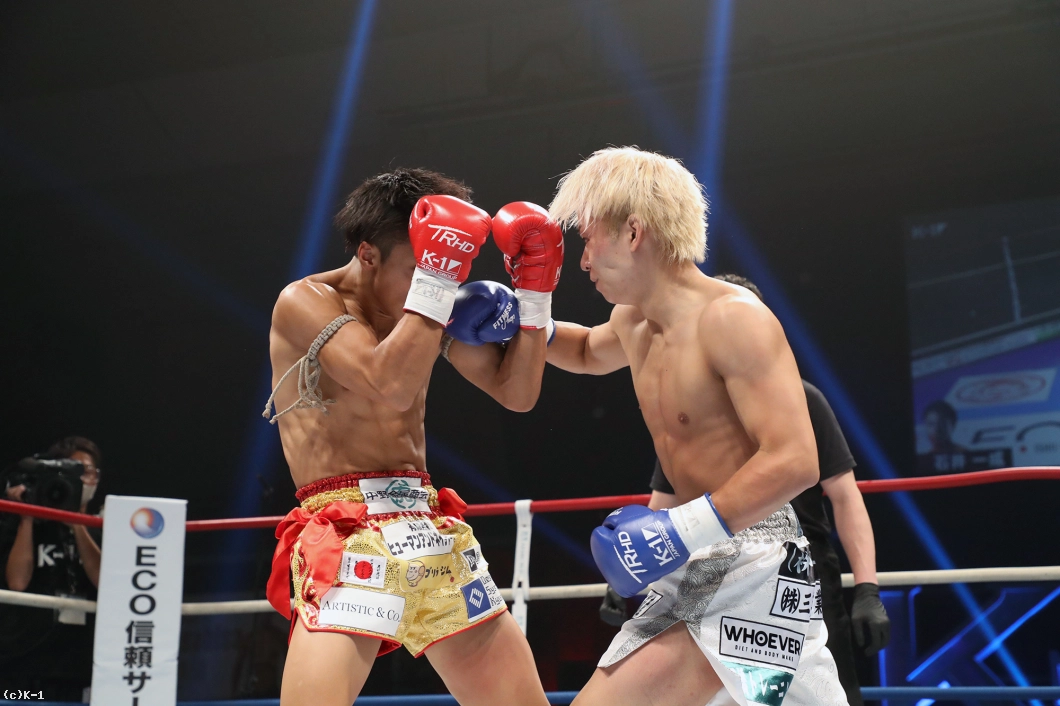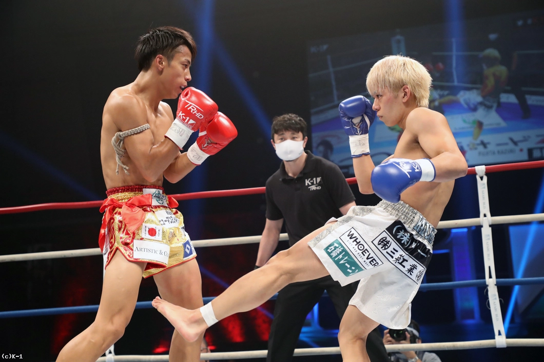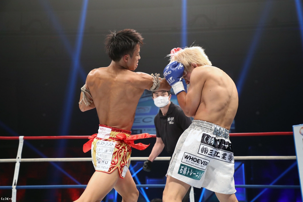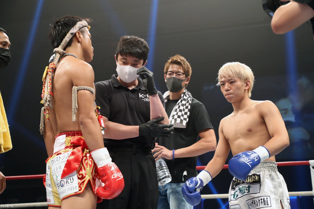 「(試合の感想は?)まずデビュー戦ってことで、ムエタイルールからキックルールに。まああの、純粋っていうか、つかみなしのルールは初めてだったんで。チームの中で、1Rは感覚つかむだけでいいよ、蹴って蹴ってという感じで話してて。倒しにはいくんだけど、KOにこだわらなくていいっていう話をしていて。