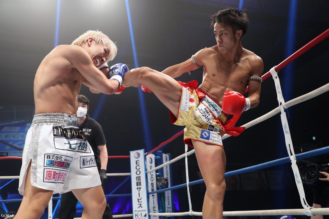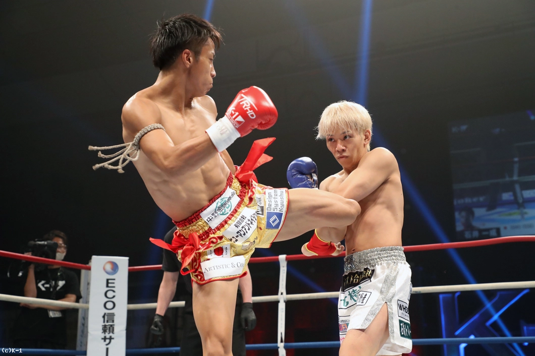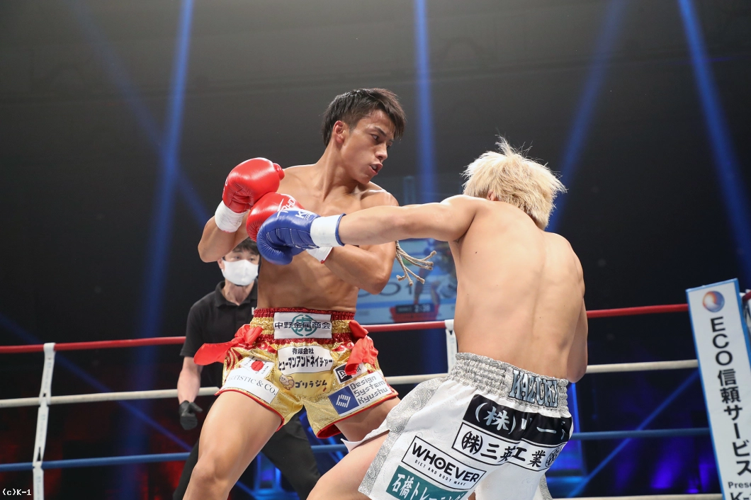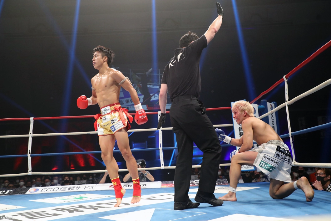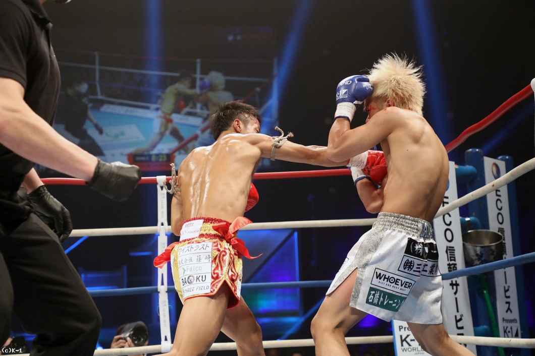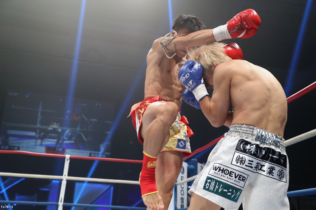 「(試合の感想は?)まずデビュー戦ってことで、ムエタイルールからキックルールに。まああの、純粋っていうか、つかみなしのルールは初めてだったんで。チームの中で、1Rは感覚つかむだけでいいよ、蹴って蹴ってという感じで話してて。倒しにはいくんだけど、KOにこだわらなくていいっていう話をしていて。