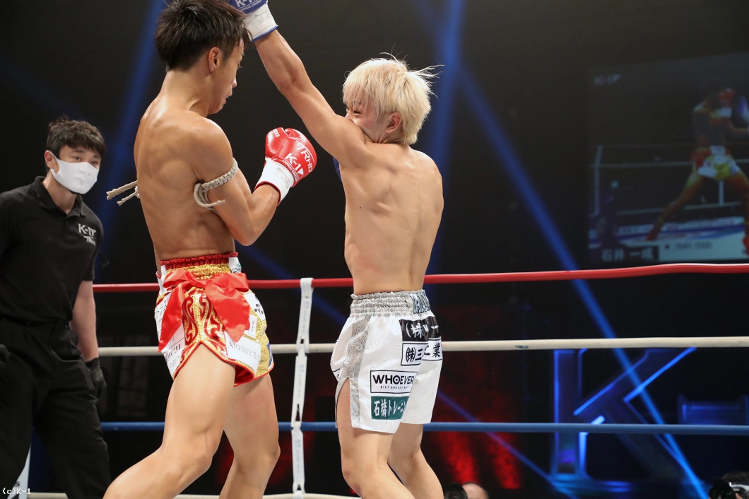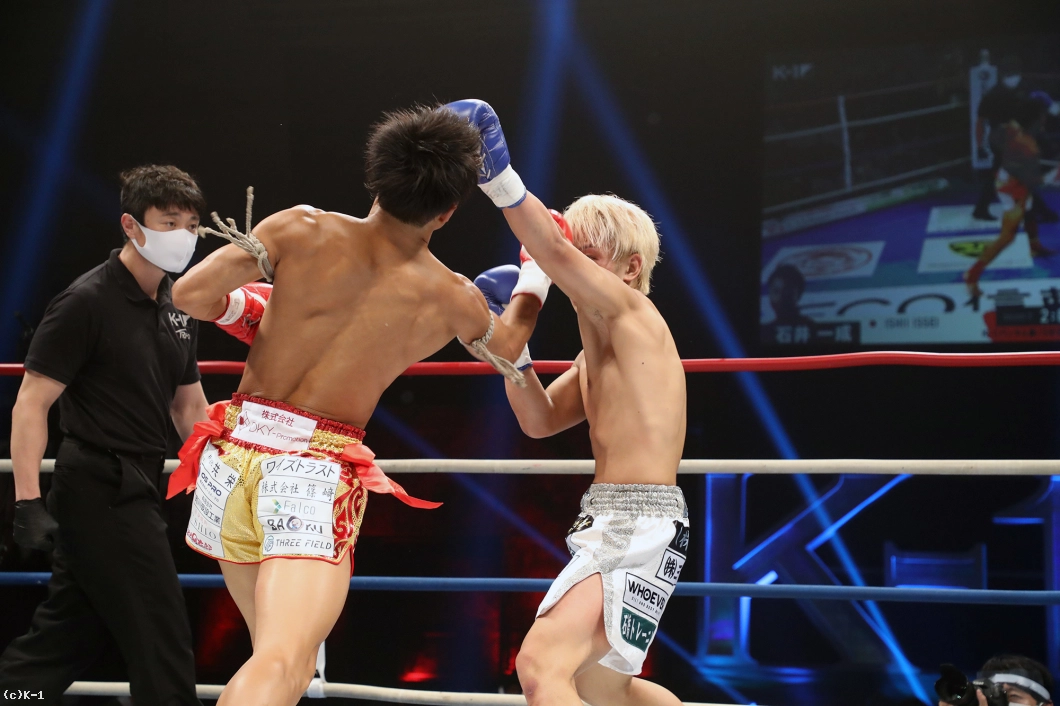 ドクターチェックの後で再開。石井は右ストレートと左フックで倒しに掛かり、右ストレートで藤田を打ち倒してKOした。