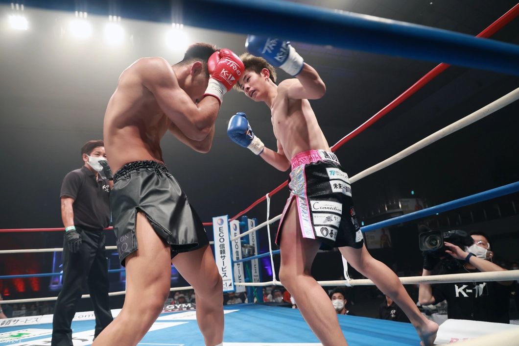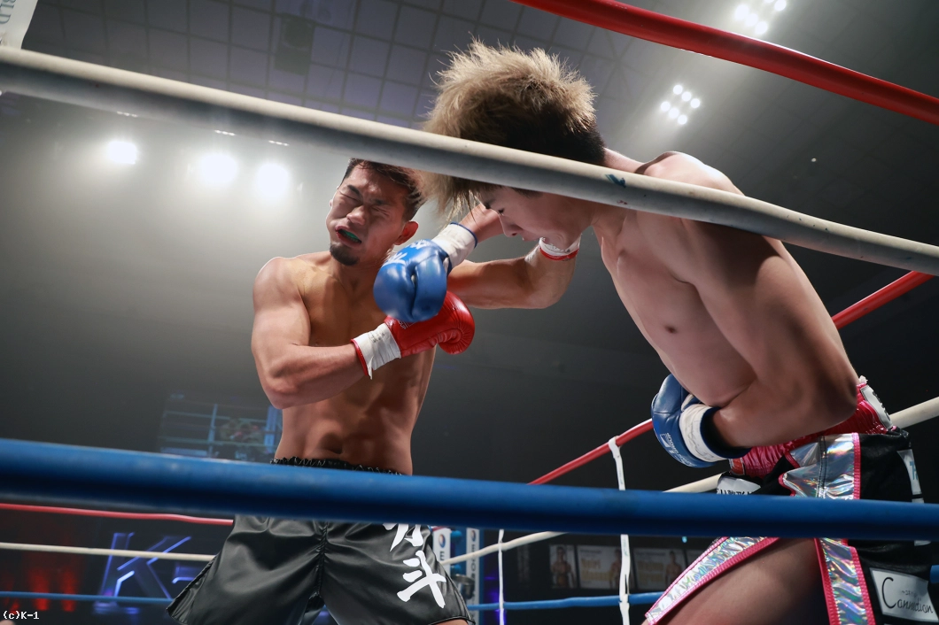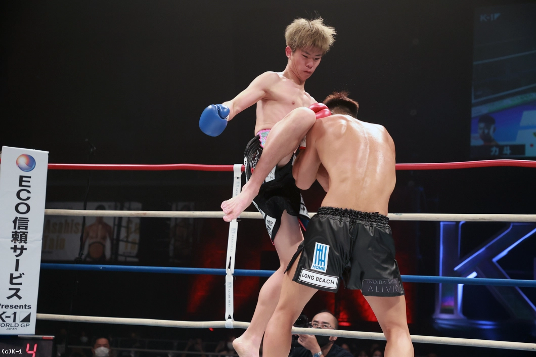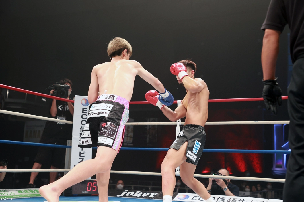 反撃に向かう力斗に対し龍之介はしかし冷静さを崩さずカーフキックで足元を崩す。前に出て距離を潰していく力斗だが、龍之介はブロックとヘッドワークで当てさせない。
