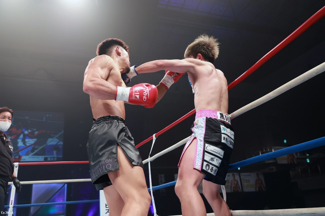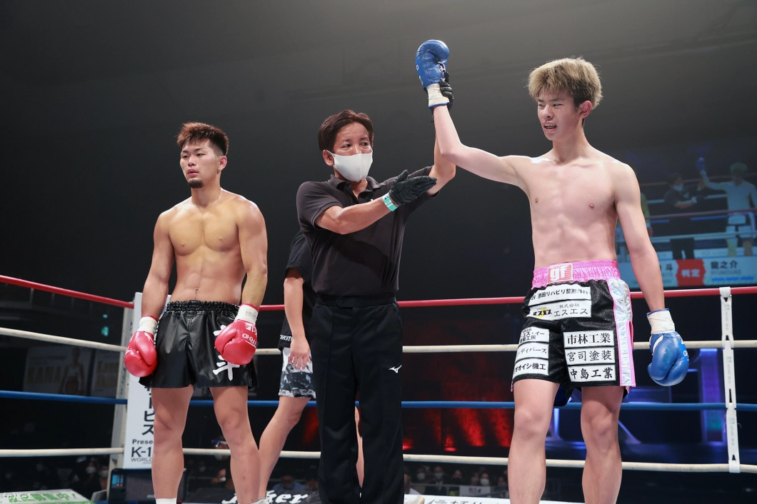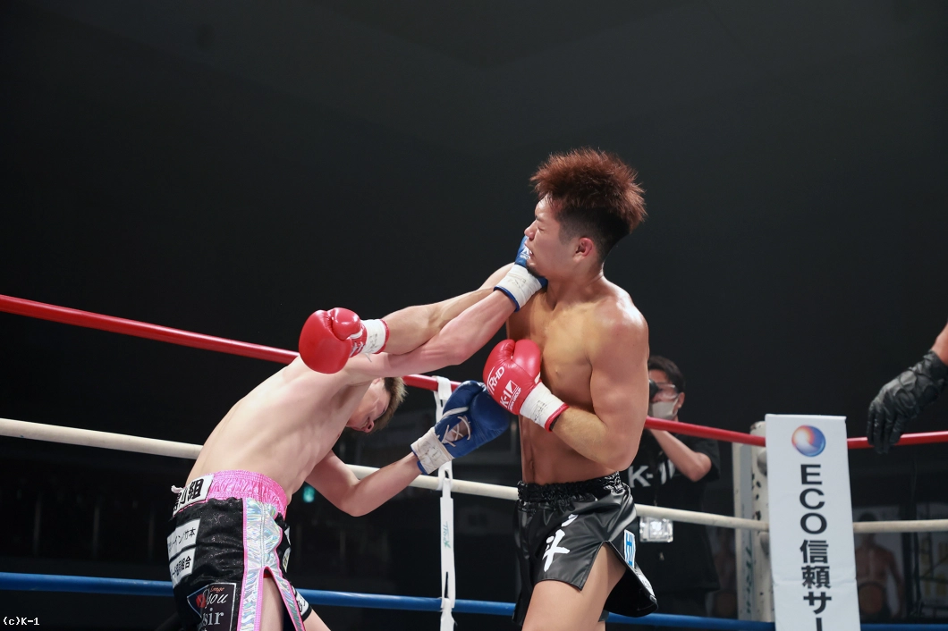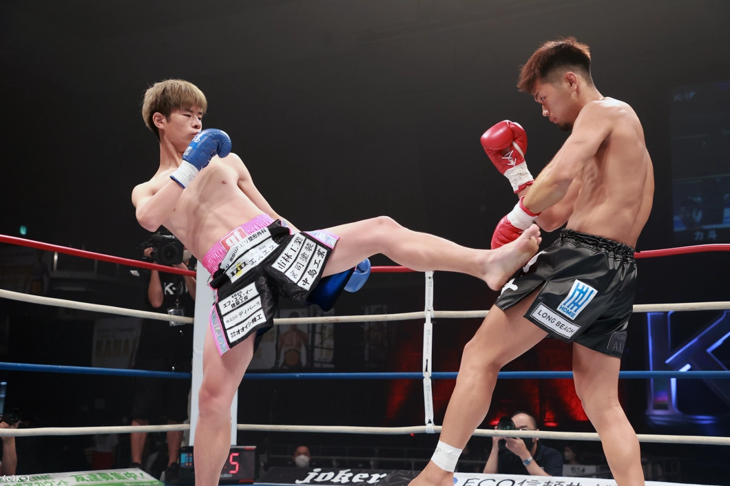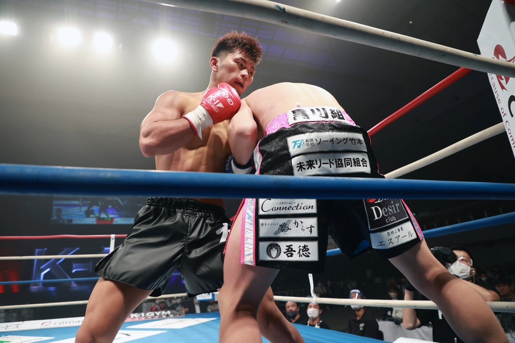 反撃に向かう力斗に対し龍之介はしかし冷静さを崩さずカーフキックで足元を崩す。前に出て距離を潰していく力斗だが、龍之介はブロックとヘッドワークで当てさせない。
