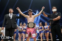 (どんなチャンピオンになりたい?)今回『K-1 NEXT』って謳われてたんですけど、僕、武尊選手と一個しか歳が違わないんで。ほかにもいい選手がいると思うんで、また、いい選手に次のNEXTになってもらってと思っています。僕がこのベルトを防衛し続けて、武尊選手のあとということで、この価値を下げないようにと思ってます。(ファンにメッセージを)今日は僕を信じて応援してくれたファンのみなさん、ありがとうございました。おかげでベルトを獲ることができました。まあ、ここで満足しないで上を目指してがんばっていきますので、今後ともよろしくお願いします」