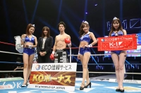 「どうも、金子です。K-1ファンのみなさん、6月に不甲斐ない結果で申し訳ありませんでした。いまK-1 NEXTって言われてるんですけど、他団体のチャンピオンに負けてそのまま名乗れないと思ってますし、またできる機会がほしいとなと思ってます。それまで強くなって、できる機会があればなと思ってます。今日はありがとうございました」