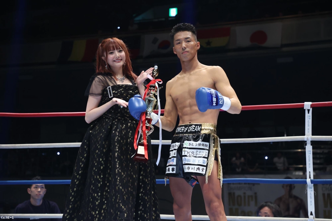 1R、両者オーソドックスで距離を詰めていく晃貴に岩尾はジャブと左右ミドル。このミドルを的確に当て、ボディフックを打ち込むと、晃貴はたまらずダウンを喫する。再開後、立ち上がった晃貴に岩尾は攻め手を緩めずミドルを見舞い、最後は再びボディフックを打ち込み晃貴を沈めた。勝利した岩尾はスペシャルラウンドガールの安斉かれんさんからトロフィーを贈られた。