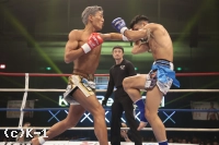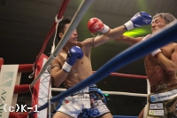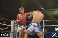 1R、サウスポー構えの黒田は下がりながらローキック。石井は右ローキックを飛ばす。黒田は距離を取りながら左を伸ばす。黒田は左ハイキック、さらに左ストレートを放つ。石井は圧をかけて右ローキック。黒田はワンツーからローキック。黒田は左を伸ばす。詰める石井は、右ミドルキック、さらに飛びヒザ蹴り。右から左につなげる石井は、左、右のコンビで攻撃した。