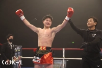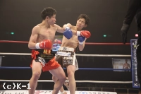2R、原田はジャブをついて天野を下がらせるようにする。天野が左を合わせてダウンを奪い。原田が立ち上がるも、レフェリーが試合を止めた。
