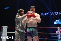 マイクを握ったジャンウォンは、「今回の試合で、いい結果を出せた。今後のK-1の大会でもカッコいい姿を見せたい」とアピールした。