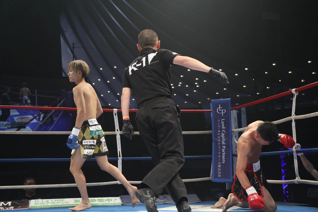 1R、上野は二段蹴り。河北はガードし、右のパンチを放つ。上野は前蹴りを顔面へ。上野は左右のパンチから、右ヒザ蹴りでダウンを奪う。河北は立ち上がるも、上野は左右のパンチも猛攻を仕掛ける。上野の右、左とパンチが入りKO勝ち。弟に続き、兄の空大もKO勝ちを奪った。