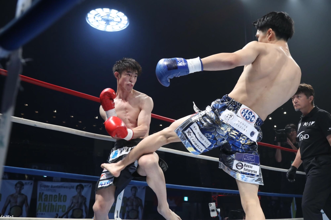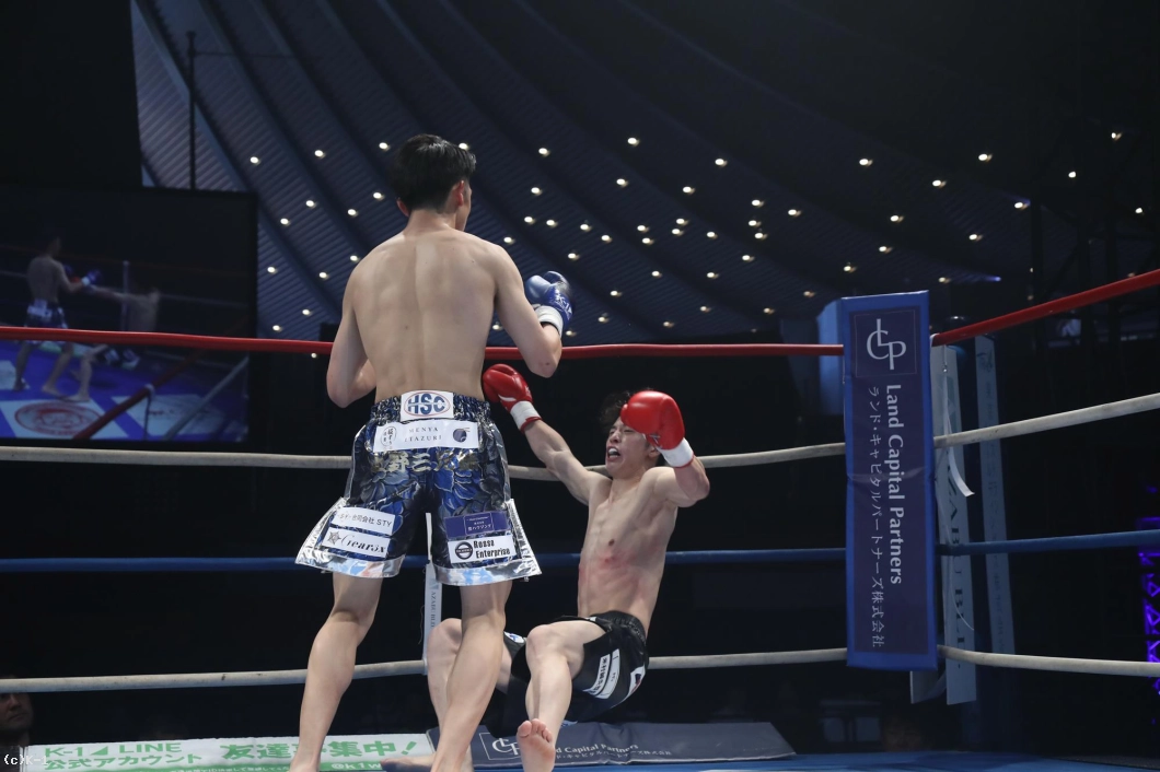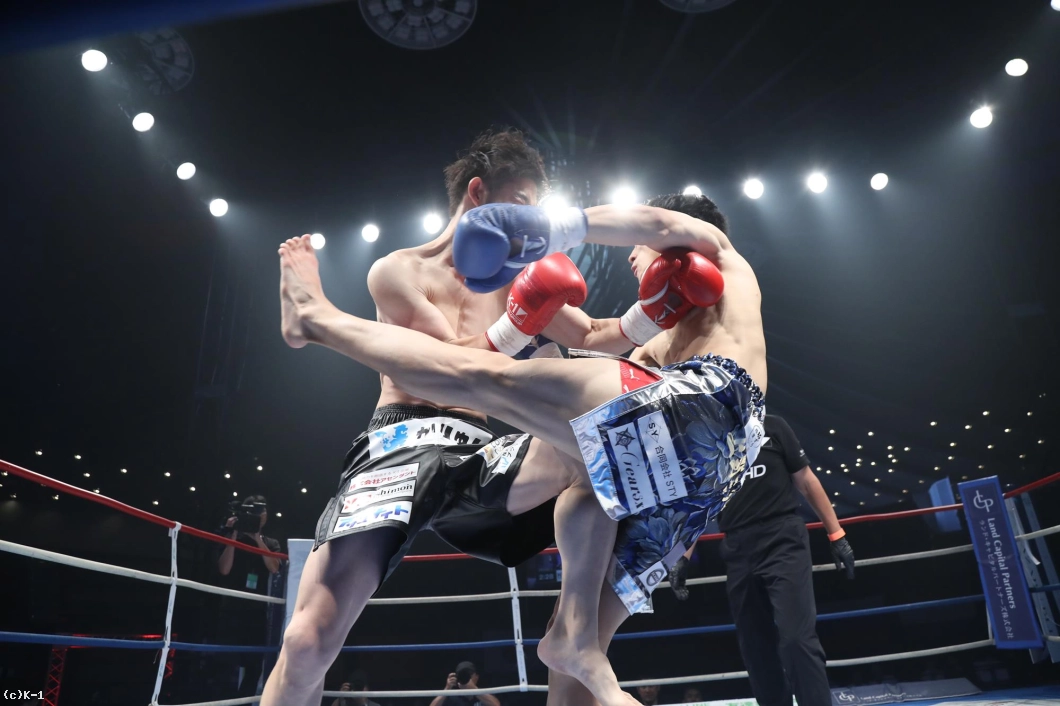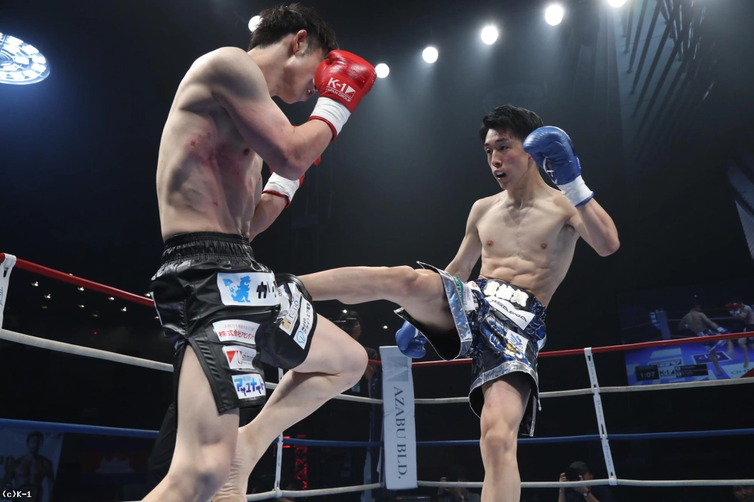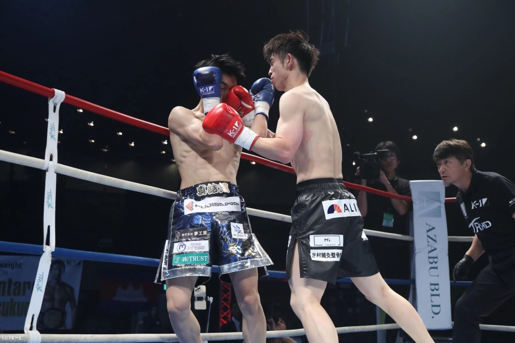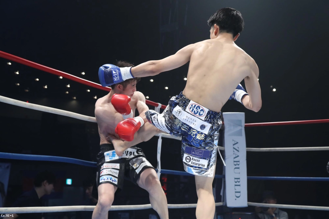 1R、サウスポー構えの上野は二段蹴り。右を入れて、ヒザ蹴りをボディいれてダウンを奪う。上河内は防戦一方で、上野のミドルをもらい二度目のダウン。上河内は右のパンチを返し、意地を見せる。上野はミドルを中心に攻めるも、ラウンド終了。