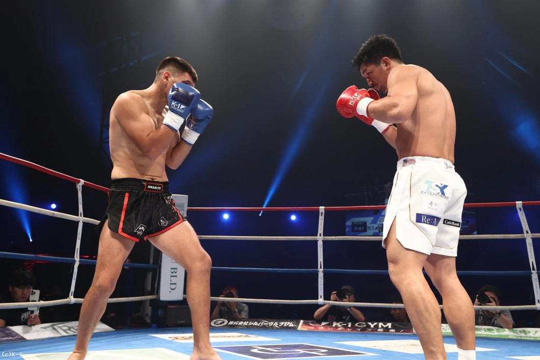 1R、アマリティはローキック。松倉もカーフキックで削りに行く。ヒザ蹴りで崩しにかかる松倉。アマリティは右の強打。松倉はインロー、カーフキックでダメージ与えに行く。松倉は前足と奥足を狙う。アマリティの右フックも、これは松倉が耐える。アマリティは右アッパー、右の強打で松倉に連続で襲い掛かる。