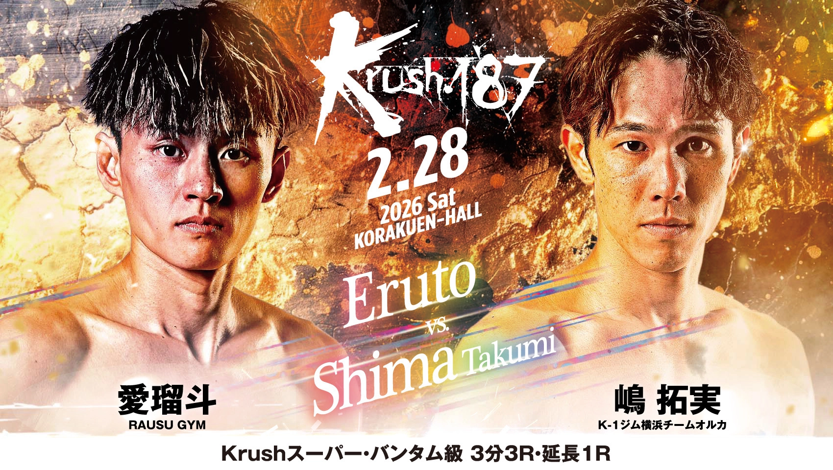 2月28日(土)後楽園ホールにて開催される「Krush.187」の[第5試合/Krushスーパー・バンタム級/3分3R・延長1R]で対戦する愛瑠斗vs嶋拓実のコメントを公開!