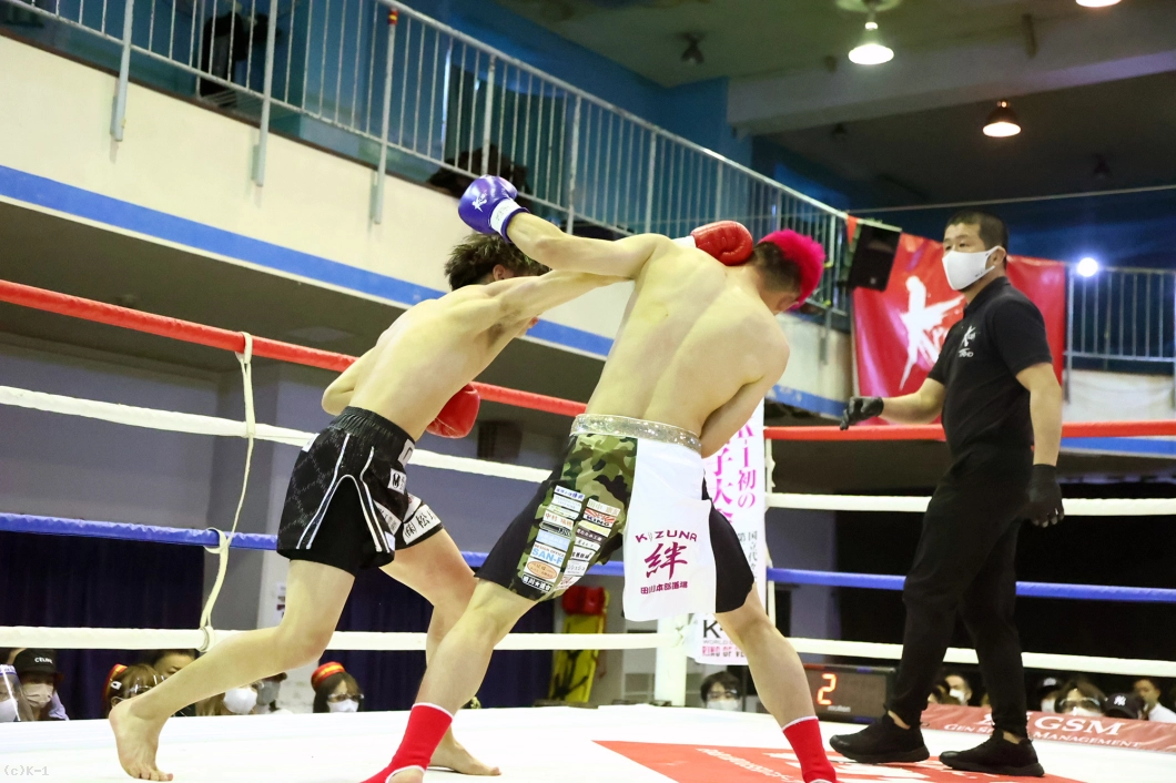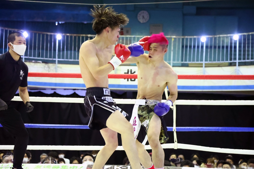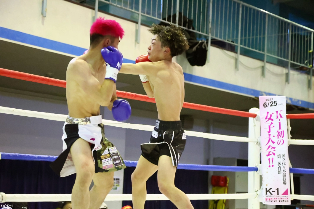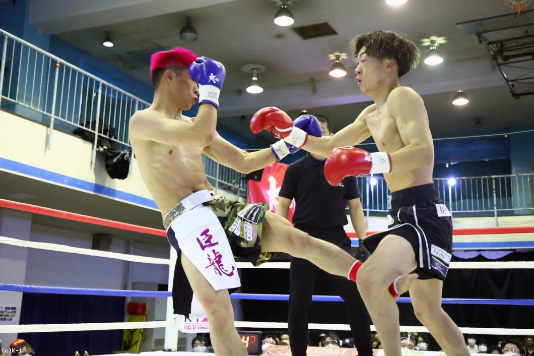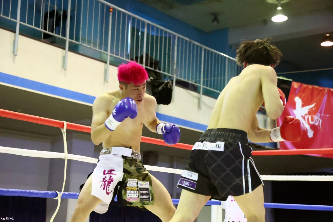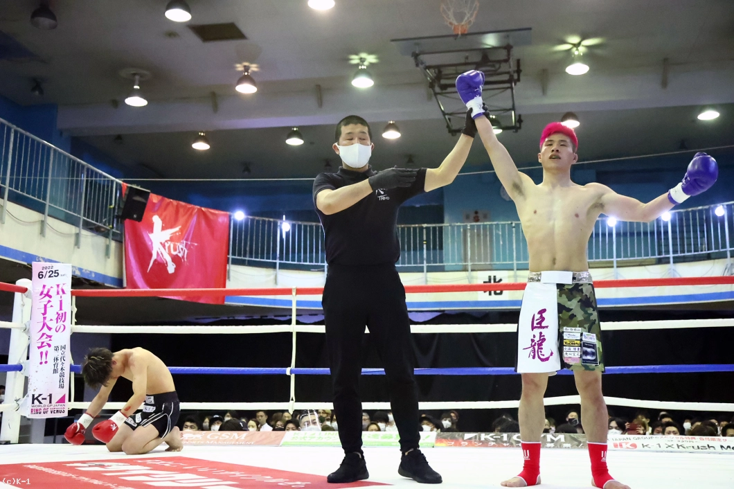 1R、ロー・ミドルを蹴り合う展開から、松本が身体を沈めての右フック。ここからパンチをまとめてダウンを奪う。2Rも松本がパンチで一気に前に出ていくが、臣龍も持ち直して真っ向から打ち合う。そしてパンチの攻防の中、臣龍がヒザ蹴りを突き上げると、この一発で松本の眉間をカットして流血。ドクターチェックが入ると、松本の傷は深く、ドクターが試合をストップ。臣龍がTKOながら逆転勝利を収めた。