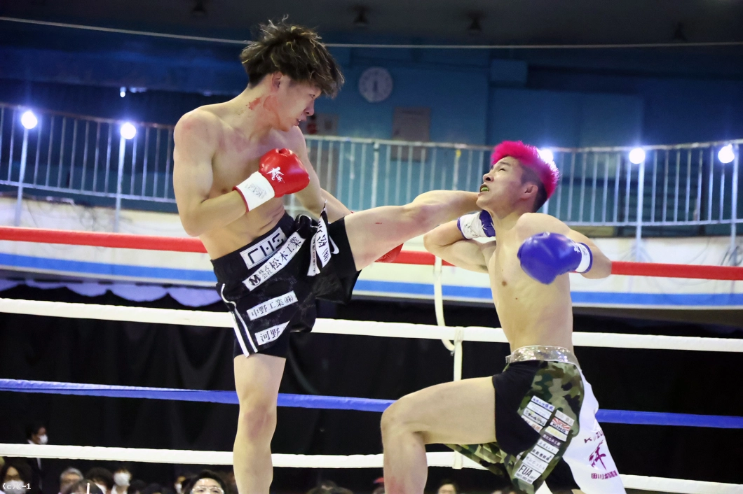 (反則となる掴んでの膝蹴りにより、松本陸選手が試合続行不可能となった為)