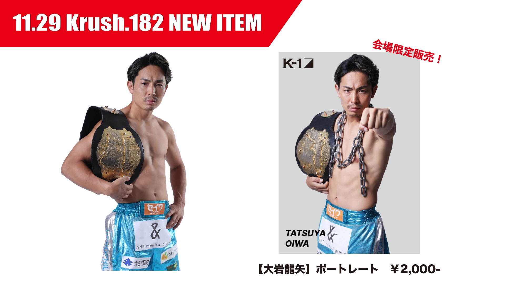 【会場限定販売!】「Krush.182」11.29(土)後楽園ホール大会 グッズ会場販売情報 2025.11.27 来る、11月29日(土)「Krush.182」 後楽園ホール大会にて、新たに販売するグッズ情報をお知らせします。ぜひ会場物販コーナーにお立ち寄りください。<商品詳細>【大岩龍矢】ポートレート販売価格:各2,000円(税込)※会場限定販売商品となります。