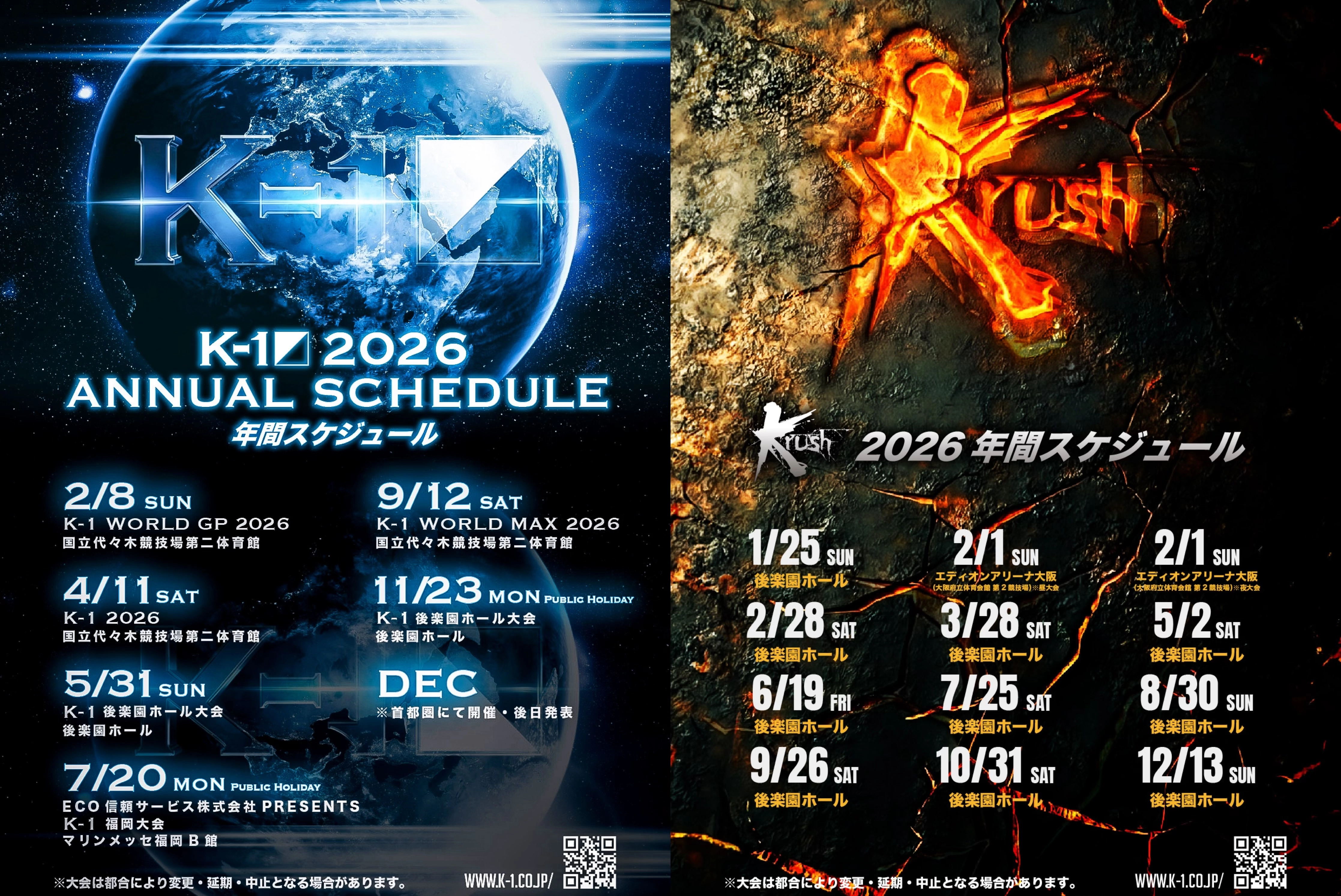 2026年の「K-1」および「Krush」シリーズの年間プロ公式大会スケジュールが、以下のとおり決定いたしました。