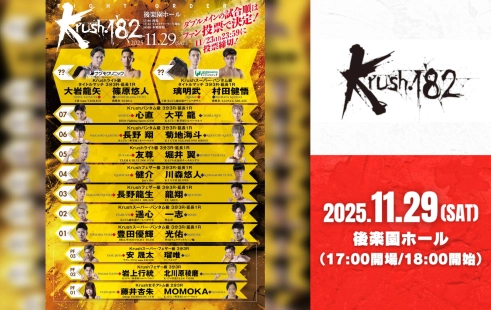「Krush.182」11.29(土)後楽園 ダブルメインイベント以外の試合順が決定!