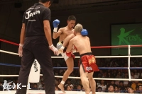 2R、翔也が距離を詰めて左ボディ、伊藤はヒザ蹴りで迎え撃つ。距離を潰して顔面とボディにパンチをまとめてハイキックを蹴る翔也。伊藤も顔面とボディにヒザ蹴りを突き刺して前進。翔也のパンチVS伊藤のヒザ蹴りという展開が続く。