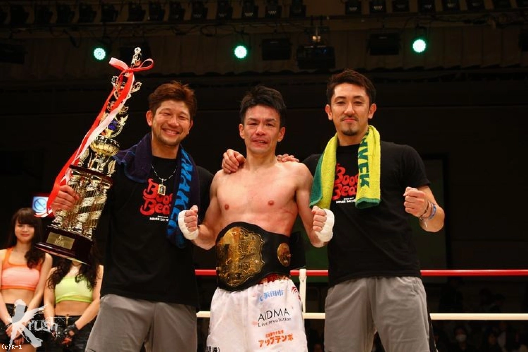 (最初から落ち着いているように見えましたが?)そうですね。向こうがアセっているなと思いました。2Rからはペースも上げてくると思ったんですけど、1Rでああいう戦いかたができたのは大きかったですね。(効いた攻撃は?)ボディはもらい続けたらイヤだなと思ったので、警戒しました。最初は打ち合って倒してやろうと思ったんですけど、飛びヒザが来る可能性もあったし、セコンドの声で冷静になりました。(今後、どんな王者を目指していきますか?)現時点で考えてはないですけど、もうひとつほしいベルトがあるので。それは一個しかないでしょ。(リングでベルトを巻くリクエストを断った理由は?)トランクスのメインスポンサーが見えなくなってしまうので、冷静に頭が働きました(笑)」
