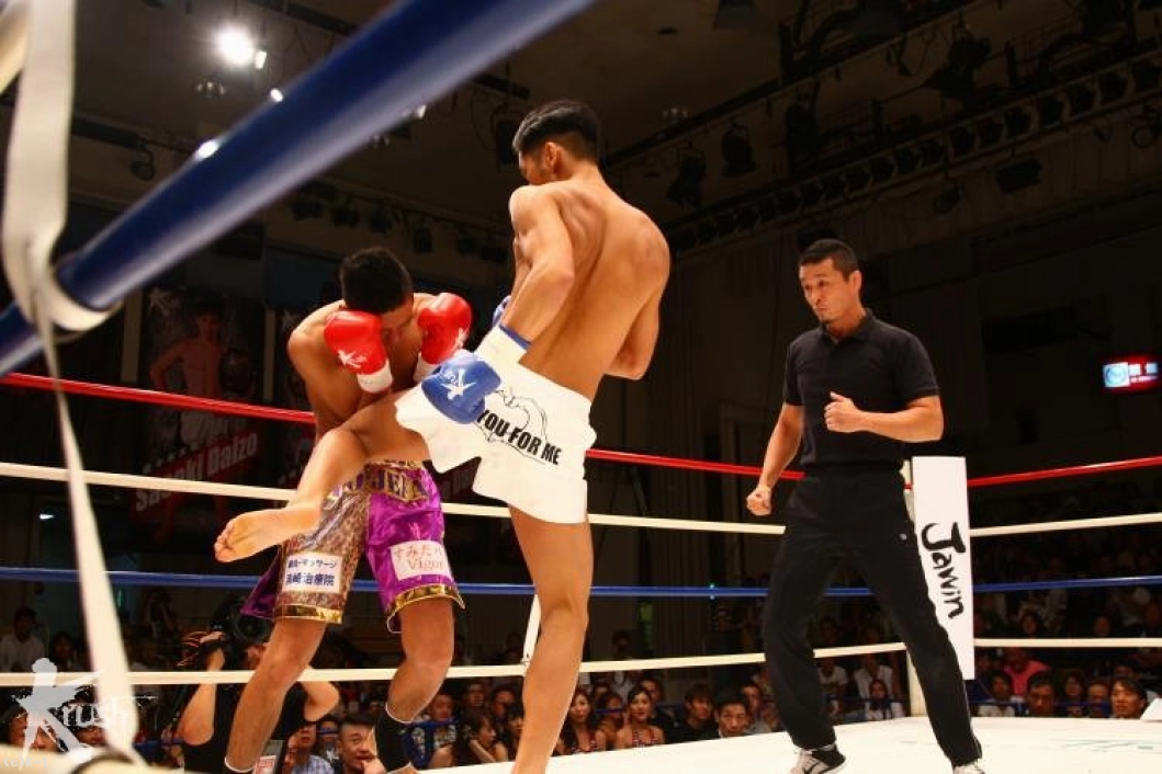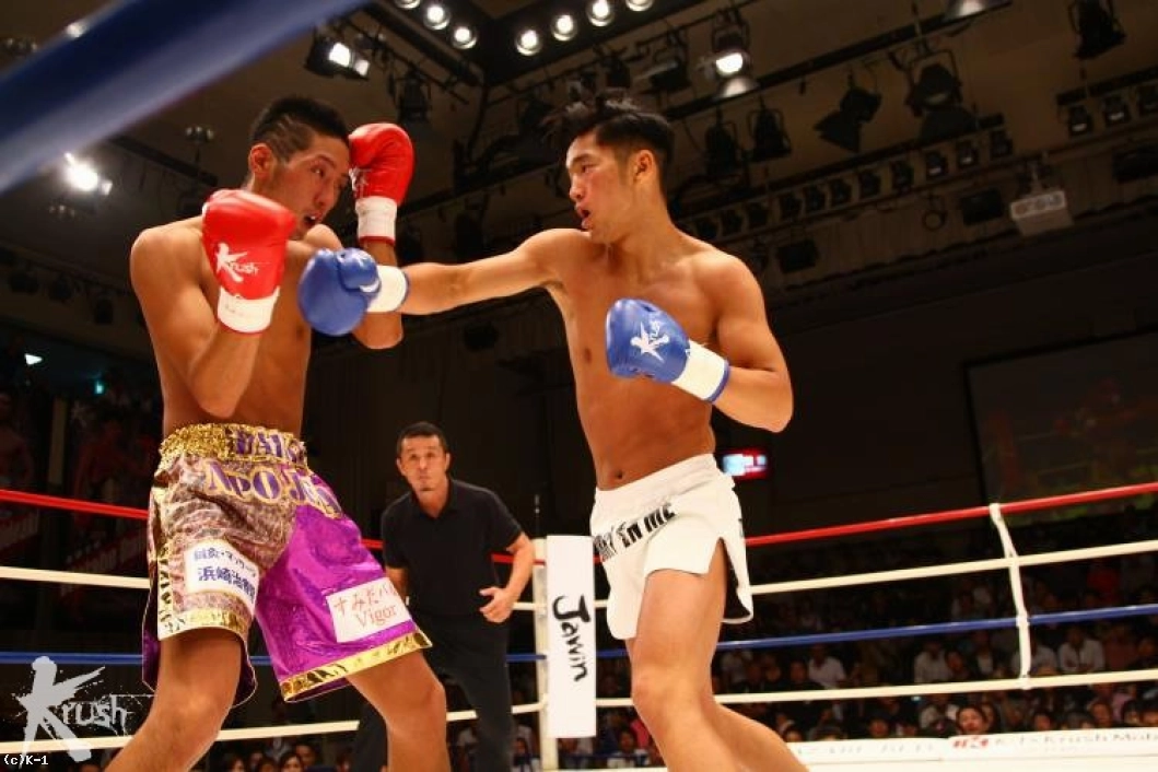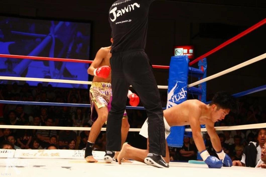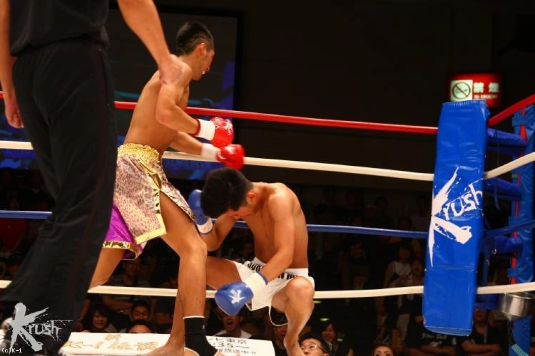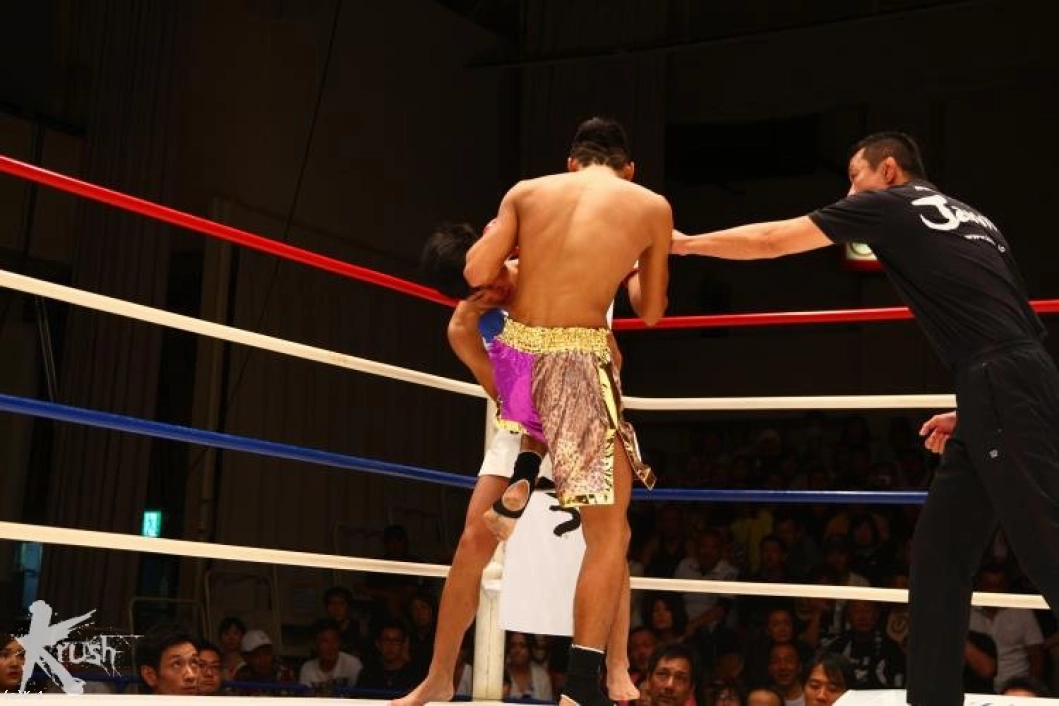 2R、上背で勝る松下は相打ち覚悟といった様子でパンチを繰り出していき、打ち下ろしの右ストレート、篠原がボディフックを放った直後の右ストレートと当てて効かせ、さらに右ミドルでも篠原のボディをとらえ失速を呼ぶ。詰めてくる松下をプッシングする篠原だが、力を欠く。フットワークで逃れるが、松下はすぐに詰めて来て、ガードの上からでもヒザを打ち込み篠原を削る。松下は左右ストレートを連打し、これで篠原を打ち倒す。立ち上がった篠原はガードから右アッパー、左フックと打ち返すが、松下は空を切らせ、ロープに詰めて左ヒザを連打。ダウンを喫した篠原は何とか立ち上がるもレフェリーは試合をストップした。